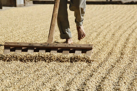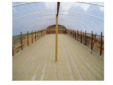 Farmers typically lay parchment to dry on raised beds that are stacked on top of each other to maximize space. Patios are also frequently used.
